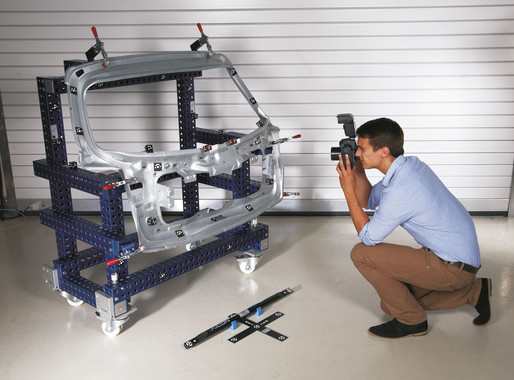 首先,在測量物件的特征部位貼上標(biāo)記點或裝上適配器。適配器可專門用于測量鉆孔、邊緣等位置,也有專門用于參考點的測量。同時,對剪切線及沖孔等位置可以直接測量,無需額外定位。然后,使用高分辨率數(shù)碼相機(jī)從不同角度對測量物體進(jìn)行拍攝,確保所有重要的物體部位都已被捕捉。